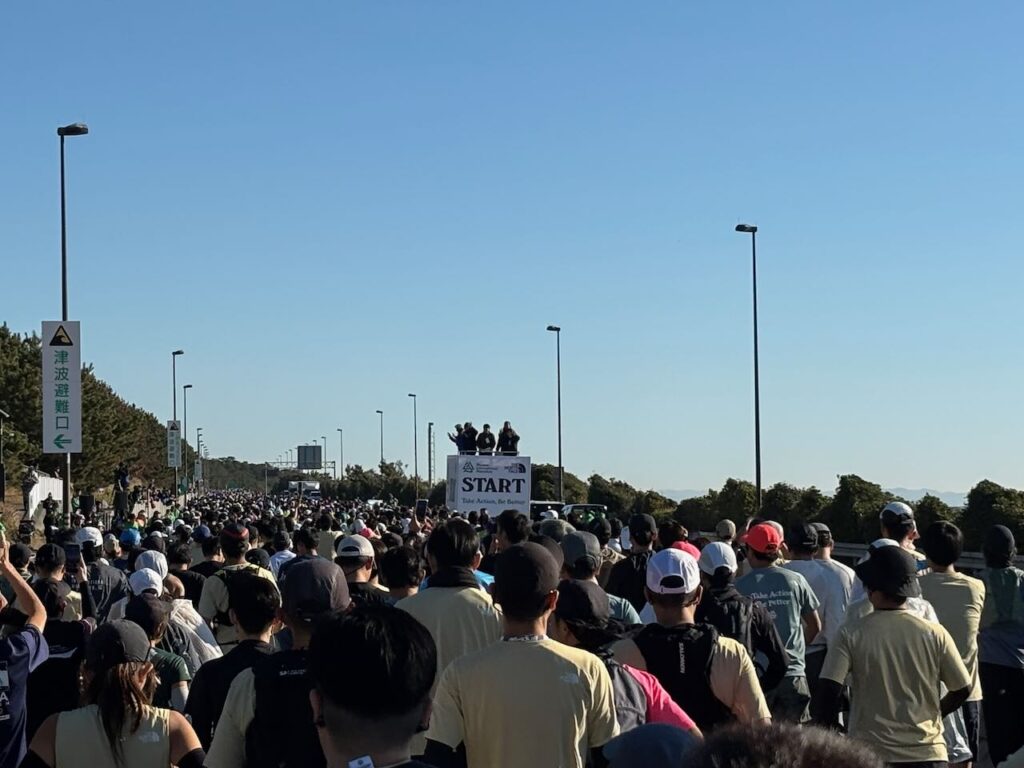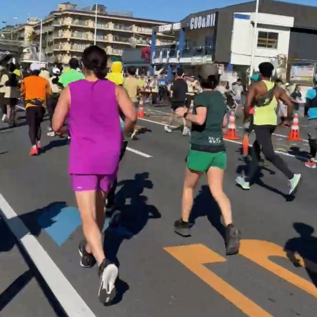 大磯の駅でバスで並び、着いたら寒くてなかなか着替えられなくて、寒さに震えながらうだうだしてたり、トイレ並んだりして、結局、後方のスタートエリアになってしまいました。