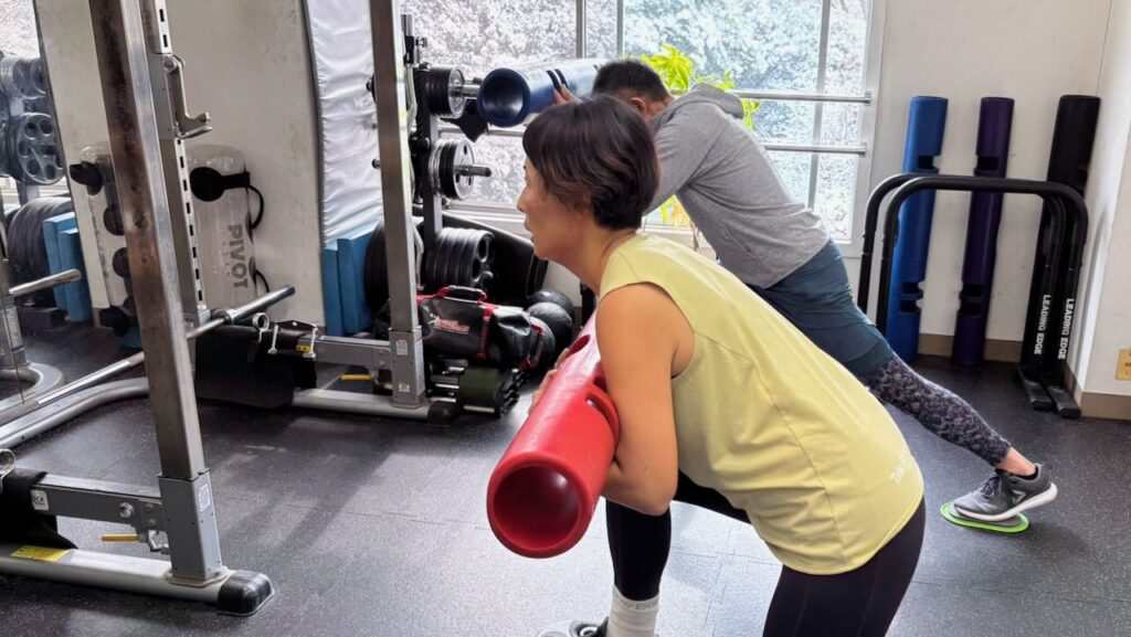 雪景色が映えるので、メンバーさんがロウイングしている写真も撮影させていただきました。後ろからなので伝わらないのですが、結構な重量を下から引いてます。しかも15回を限界まで。