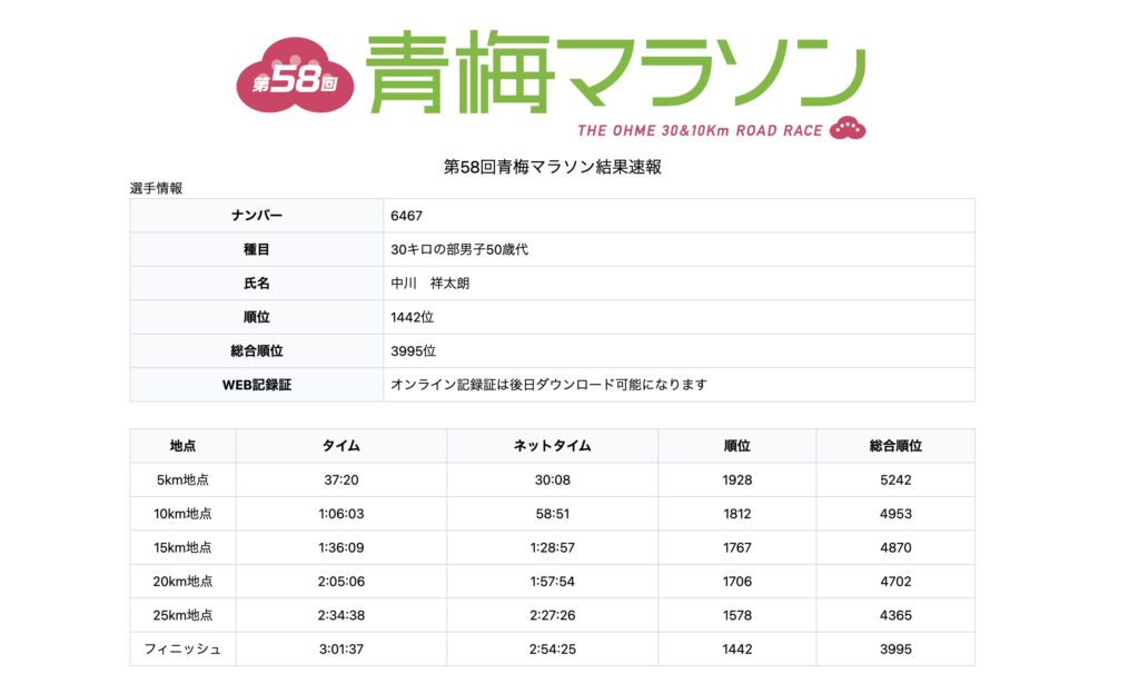 「第58回青梅マラソン完走&記録更新」ということで、今季のマラソン大会は終了です。